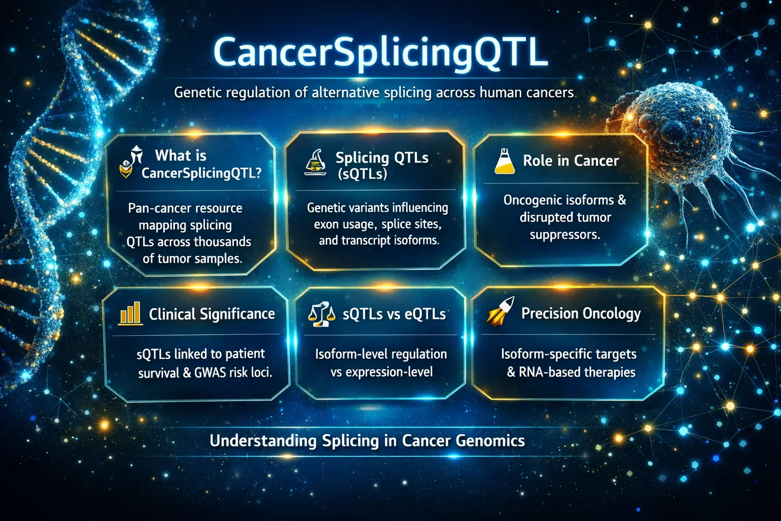 Aberrant splicing is a hallmark of cancer. Cancer-associated sQTLs can generate oncogenic isoforms, disrupt tumor suppressors, and alter signaling pathways controlling proliferation, apoptosis, immune evasion, and metastasis.